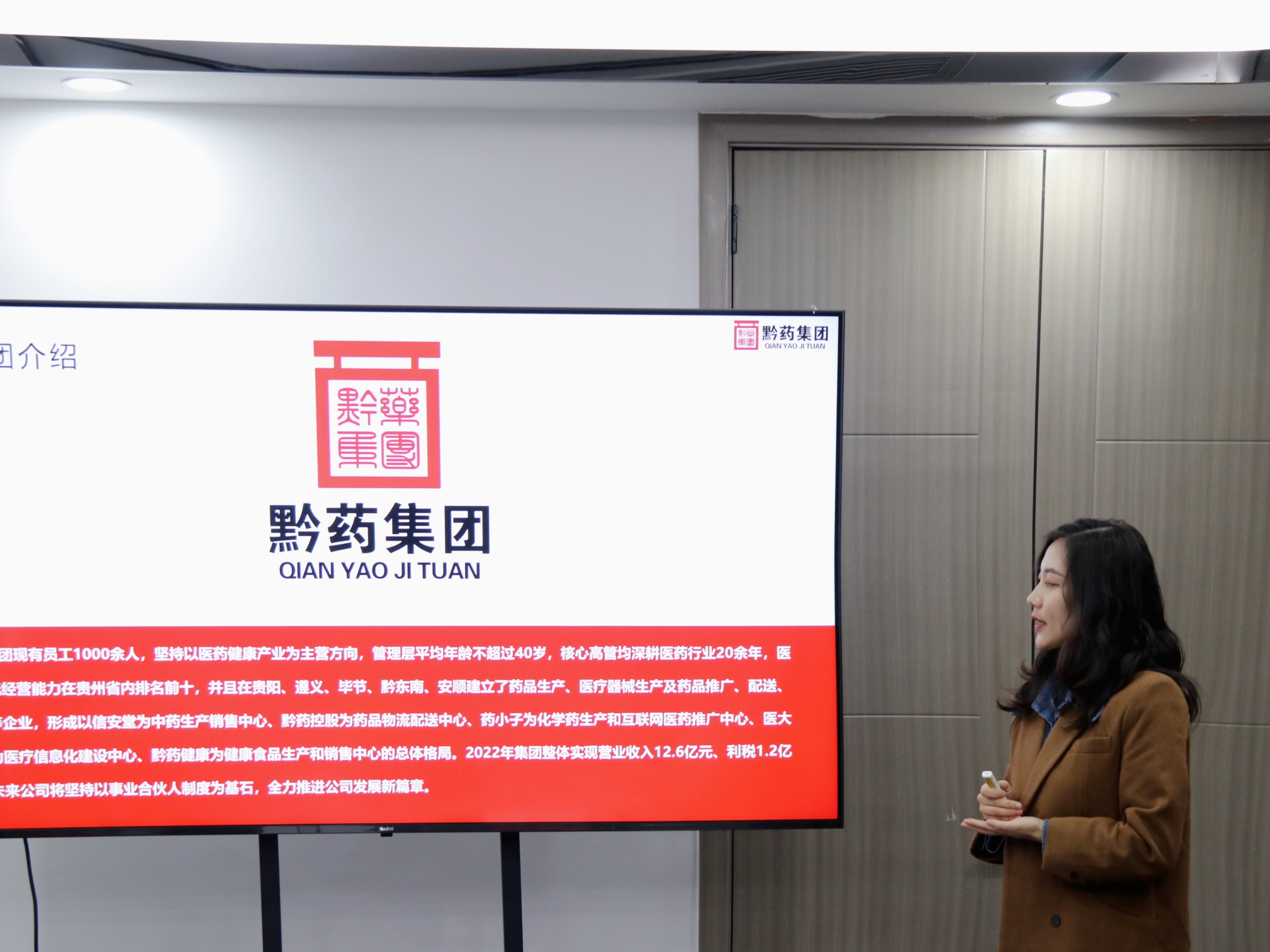 會議(yì)上,左瑩以PPT講解的形式,詳細介紹了黔藥集團的概況。展示集團的願景、使命、核心和整體(tǐ)形象,讓校(xiào)方更深入地了解集團。